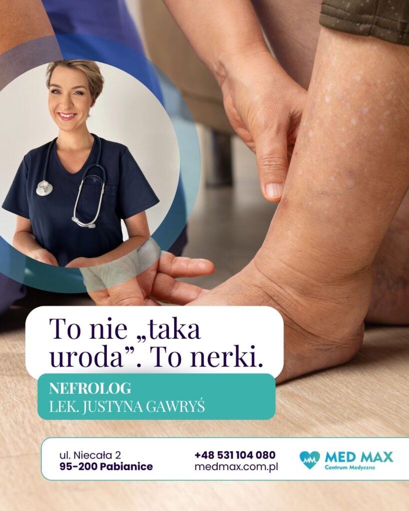 Przewlekłe choroby nerek rozwijają się cicho, ale konsekwencje późnej diagnozy są poważne. Nie bagatelizuj obrzęków nóg, zmian w oddawaniu moczu czy przewlekłego zmęczenia. Umów się na konsultację nefrologiczną u lek. Justyny Gawryś w Med Max w Pabianicach i wykonaj proste badania, które mogą uratować Twoje nerki. Zadzwoń pod +48 531 104 080 lub odwiedź naszą przychodnię przy ul. Niecałej 2, aby zadbać o zdrowie nerek.